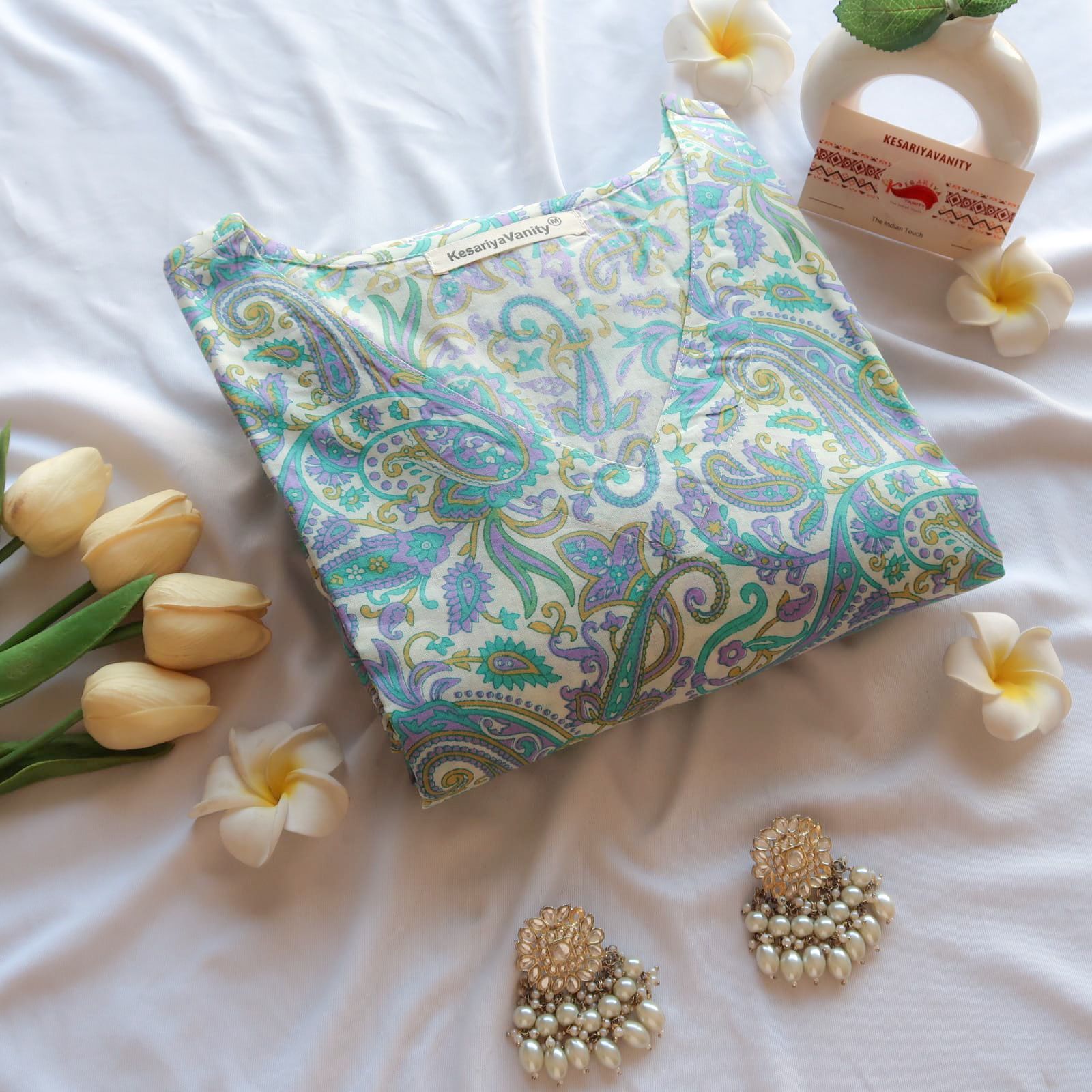 This Alia cut kurta combines simplicity and charm, crafted from soft cotton for a comfortable fit. The off-white base is beautifully decorated with vibrant multicolored booties and floral prints, adding a lively touch to its design.