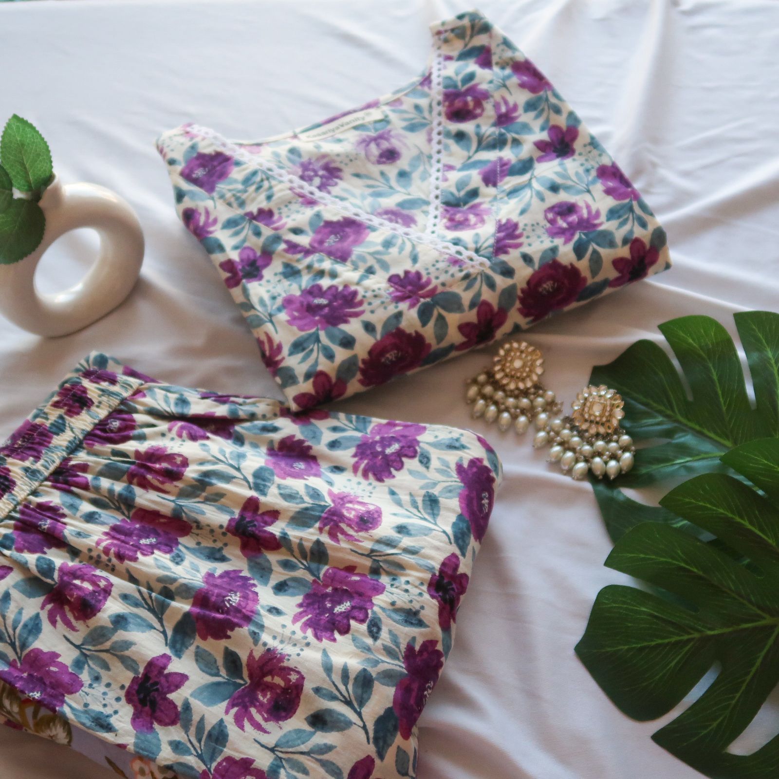 The kurta, tailored in a classic straight style. Each bloom is intricately printed, creating a mesmerizing tapestry of color and texture reminiscent of a majestic garden in full bloom.