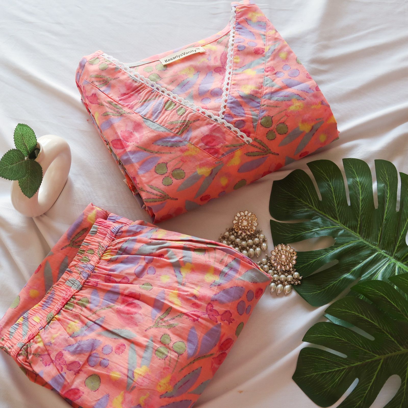 Introducing the "Blush Bloom Slim Fit Suit Set" - Crafted from premium cotton fabric, this kurta pants set exudes timeless charm and refined style with its exquisite design and intricate detailing.