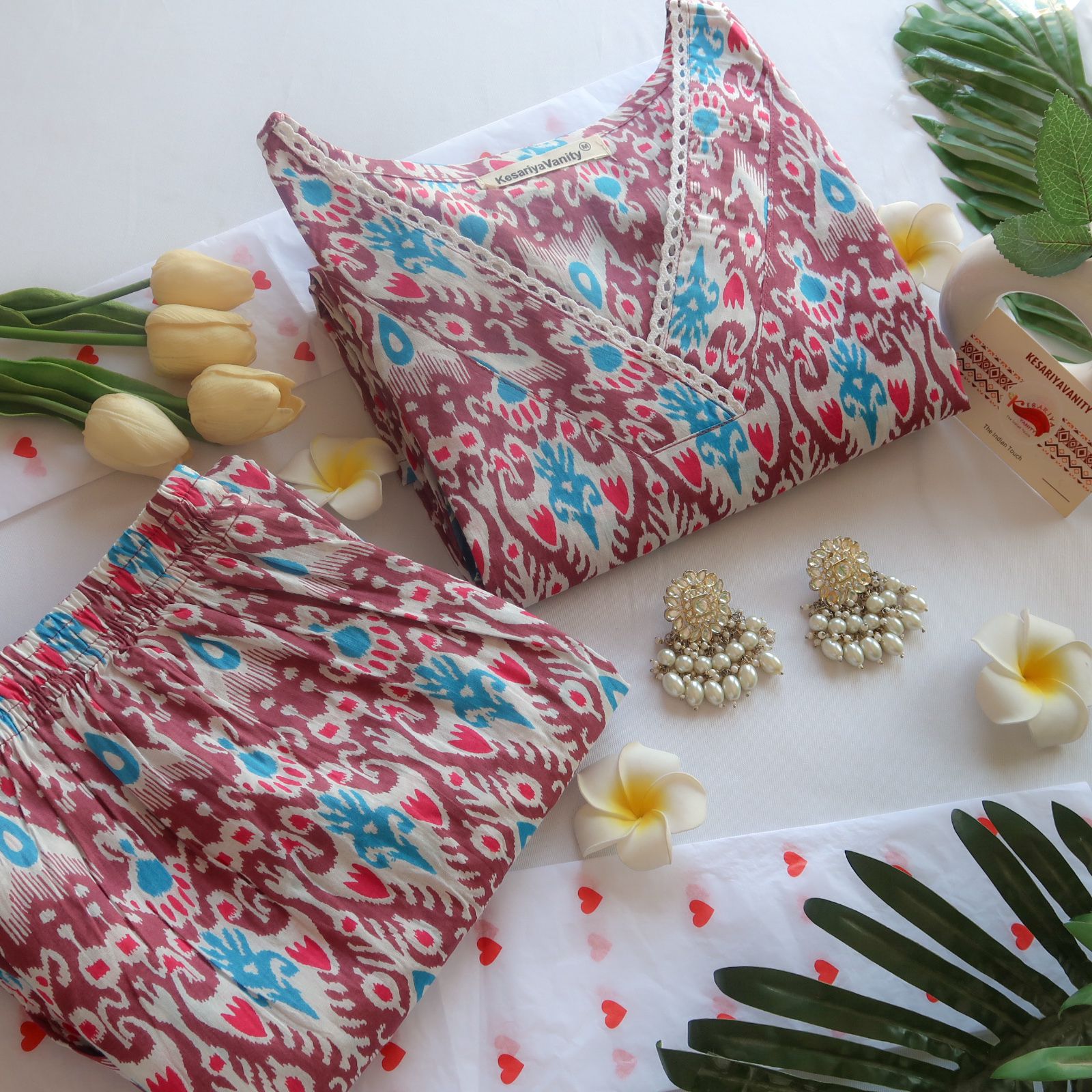 The set is completed with matching straight-cut pants, featuring the same brown base and coordinating ikat prints, offering a seamless and chic look. Perfect for casual outings, festive occasions, or work wear, this set combines color, comfort, and timeless style effortlessly.