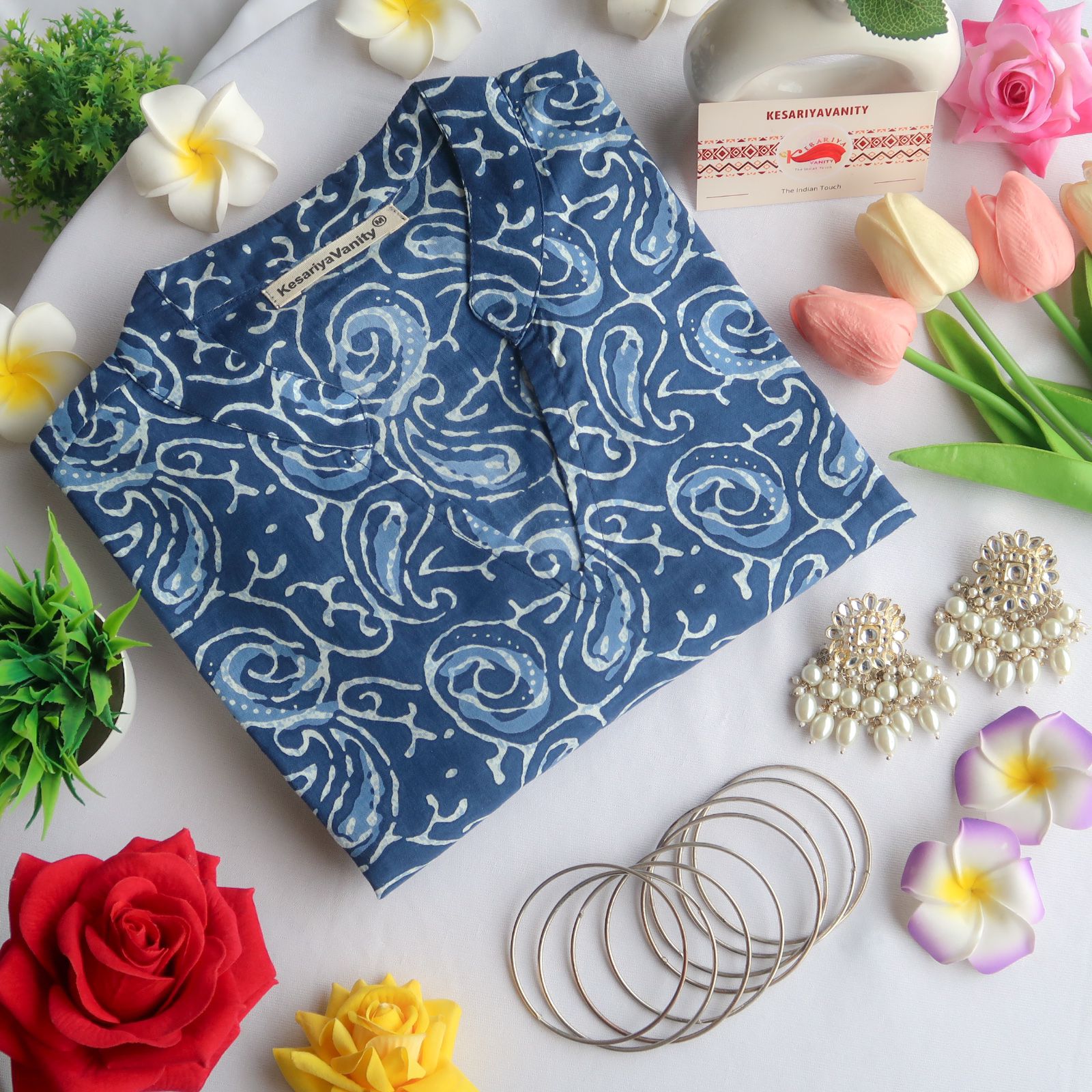 Introducing the versatile Choker Neck Straight Cut Kurta, a daily essential blending elegance with comfort. Crafted in a soothing dark blue indigo hue adorned with charming off-white bootie prints, this kurta exudes a subtle sophistication ideal for both office and college settings.