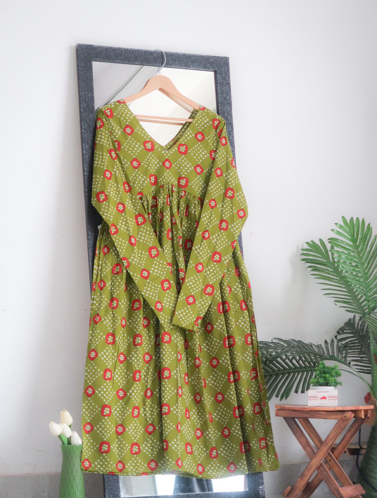 Step into sophistication with our Pure Cotton Alia Cut Churidar Kurta, featuring a captivating Bandhej print on a lush forest green base. The kurta's elegant V-neckline and full sleeves blend traditional grace with contemporary style, while the striking white and red Bandhej patterns create a vibrant contrast against the deep green fabric.