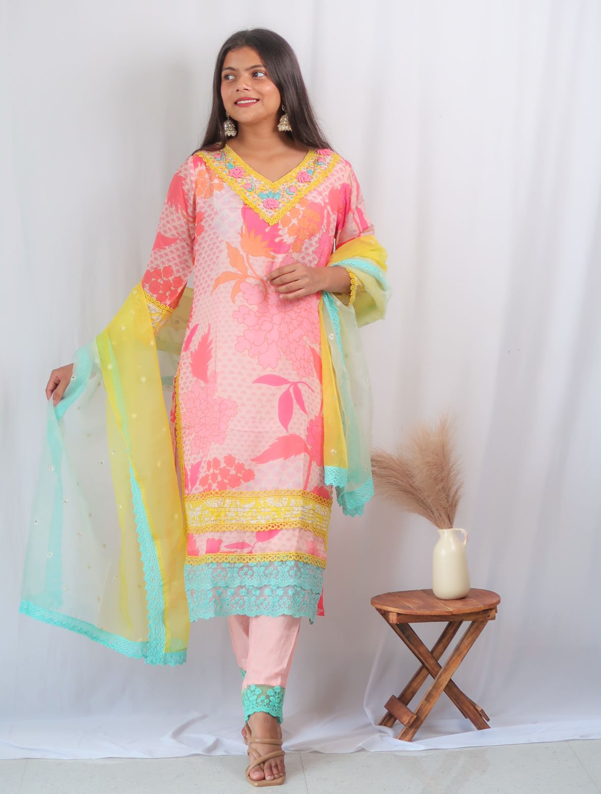 Paired with light pink straight-cut pants, the ensemble offers a coordinated and refined look. The set is completed with a contrasting yellow and sky blue mix organza dupatta, which adds a lively splash of color and is finished with sky blue lace borders for an extra touch of charm. Perfect for festive occasions and special events, this set combines vibrant colors with intricate craftsmanship.