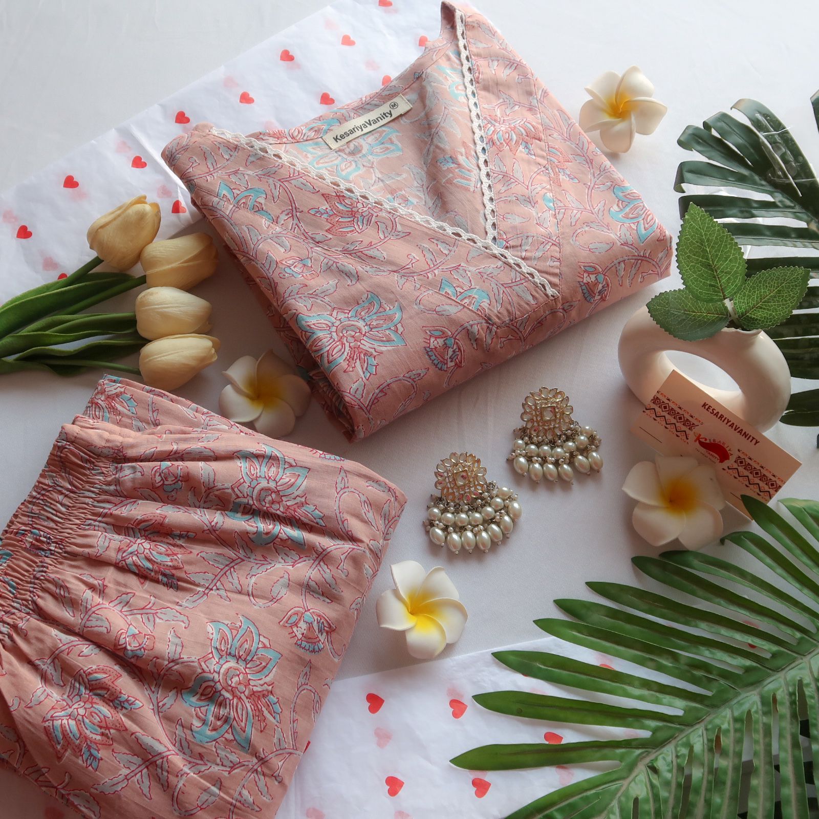 Add a touch of elegance to your wardrobe with this pure cotton straight kurta pants set, perfect for any occasion. The kurta, in a soft peach base, is adorned with delicate light multicolor floral and petal prints, bringing a refreshing and vibrant charm. The V-neckline, accentuated with white lace detailing,,enhances its feminine appeal, while the 3/4th sleeves ensure both style and comfort.